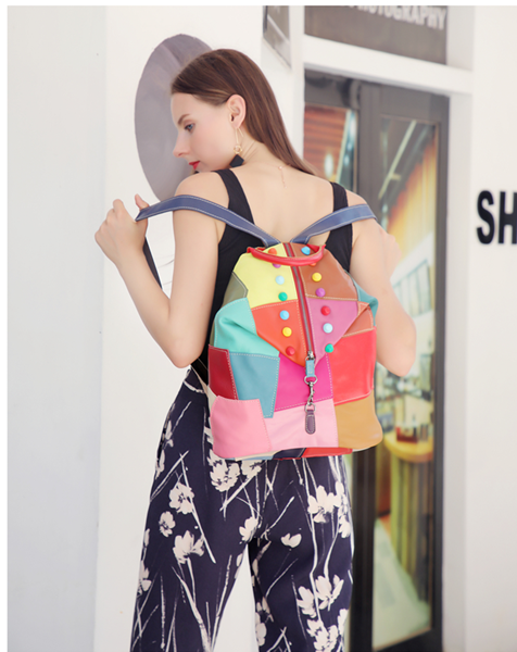 This colorful soft leather backpack is pretty,exquisite,colorful and beautiful backpack for woman and girls.Handmade patchwork travel backpack with rivet.Attractive,easy access and lightweight.