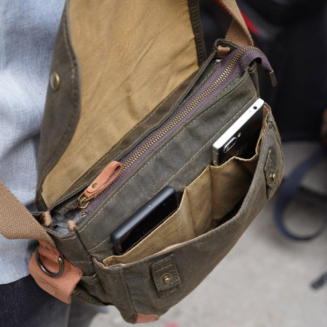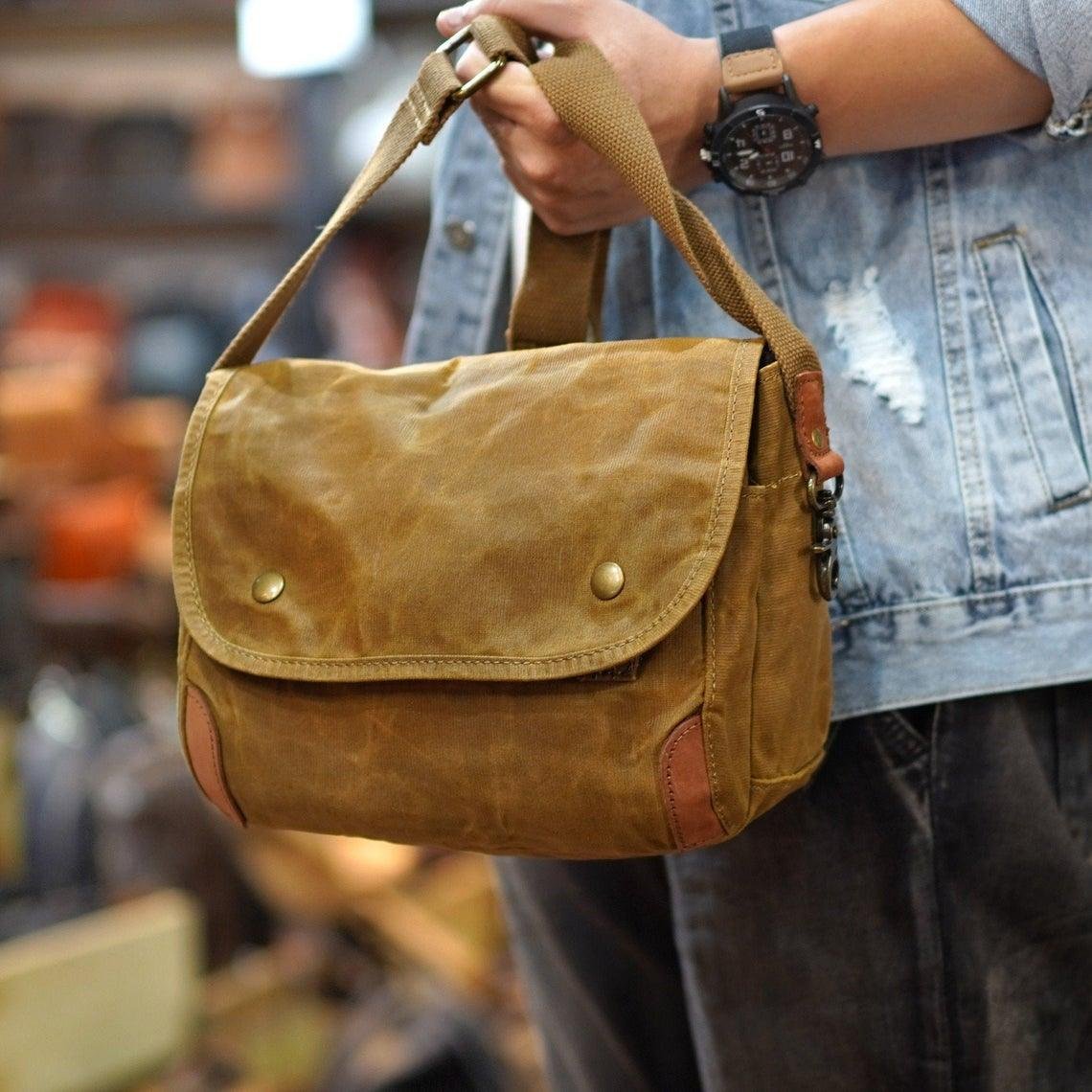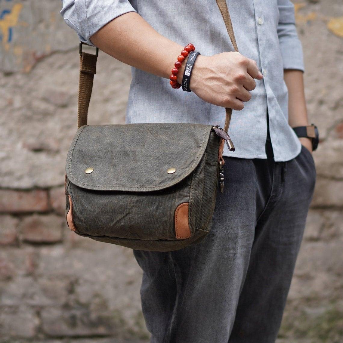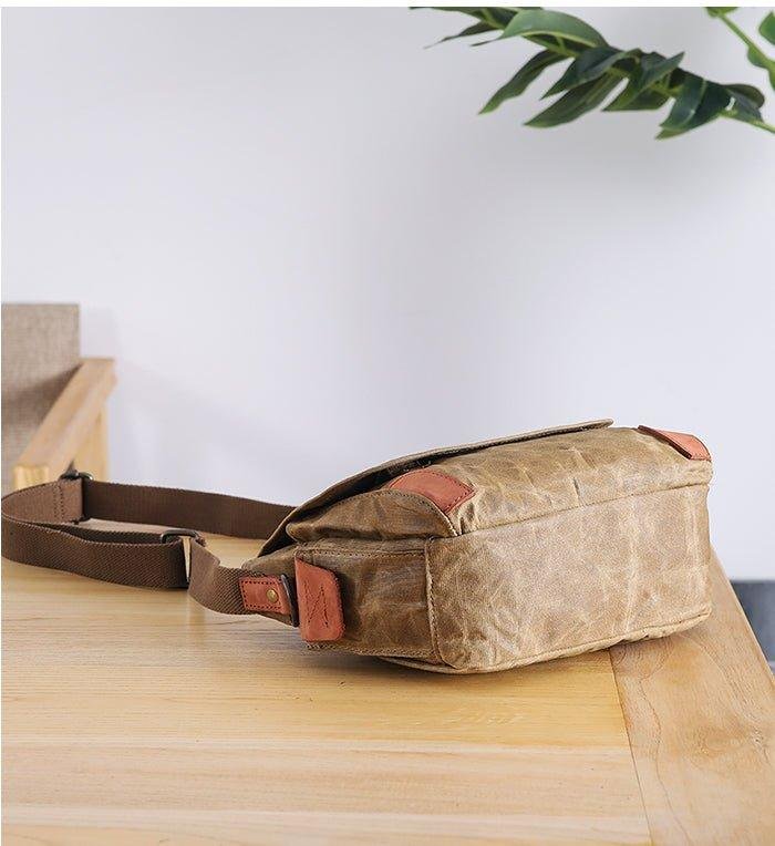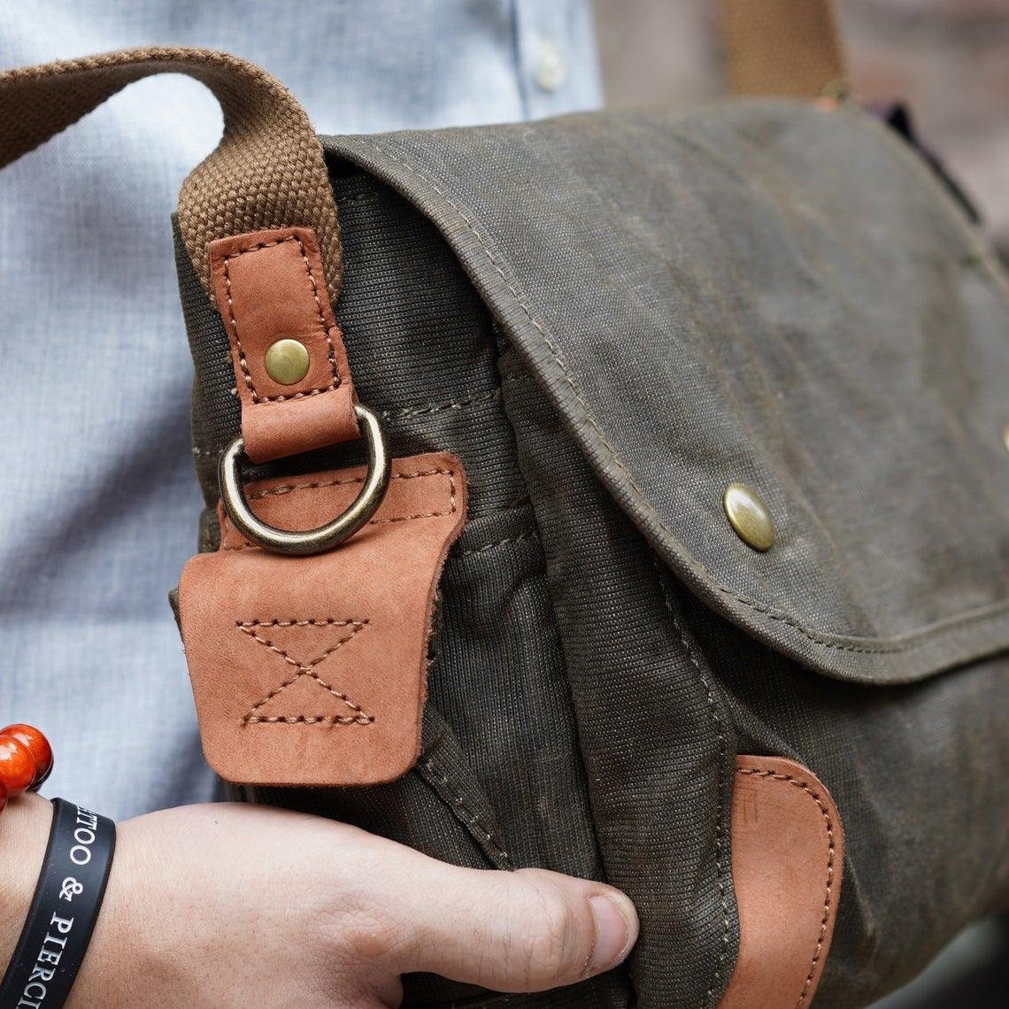 The Small Messenger Bag Waxed Canvas Mens is a stylish and functional bag that is perfect for everyday use. It is made from a waxed canvas material that is waterproof and durable. The bag features 2 side pockets for quick access items. The bag also comes with adjustable shoulder straps and a comfortable carrying handle. It is ideal for carrying laptops, books, documents, and other items.